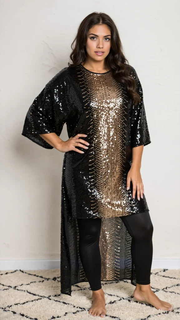 Fuse comfort and sparkle on with leggings under a sequined tunic, an athleisure-meets-glam combo for easy movement. Shine bright while staying comfy during festive family fun.