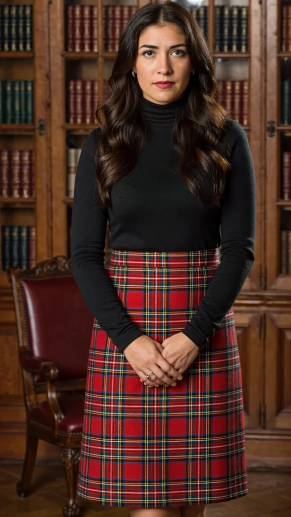 Inject heritage charm into Christmas Eve with a tartan midi skirt and solid turtleneck, blending traditional patterns with modern cuts. This festive look radiates warmth and style for holiday gatherings.