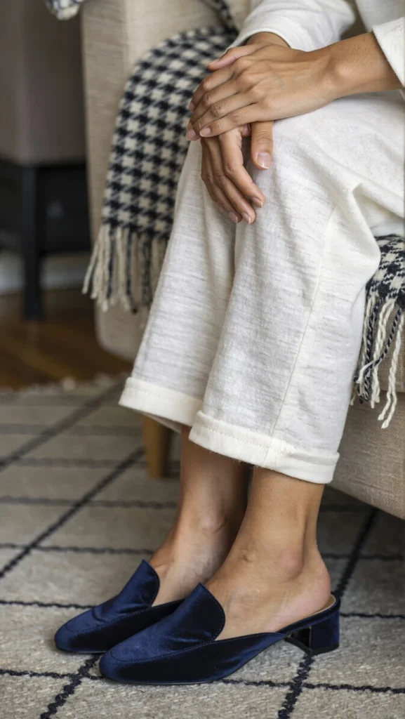 Slip into velvet mules with a subtle heel for Christmas Eve home gatherings, blending cozy elegance with luxurious comfort. These shoes elevate your look effortlessly for intimate holiday moments.