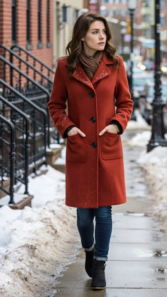 Keep it casual yet festive this with a wool red coat over jeans, channeling the season’s crimson spirit with cozy textures. It’s the perfect mix for laid-back holiday vibes that still feel special.