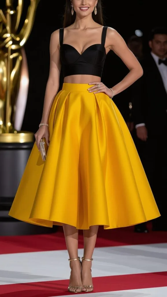 Light up the room in a saffron yellow ball skirt and black crop top. Gold heels and a delicate bracelet make this vibrant look pop at an awards ceremony.
