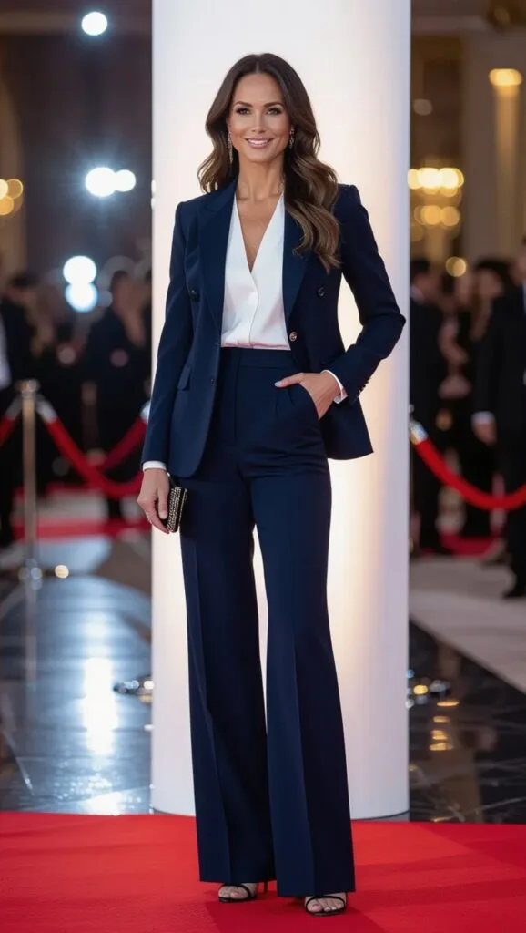 Step onto the red carpet in a navy pantsuit with flowing wide-leg trousers, paired with a crisp white blouse. A sleek blazer and minimalist clutch add polish, exuding confidence for a corporate awards night.