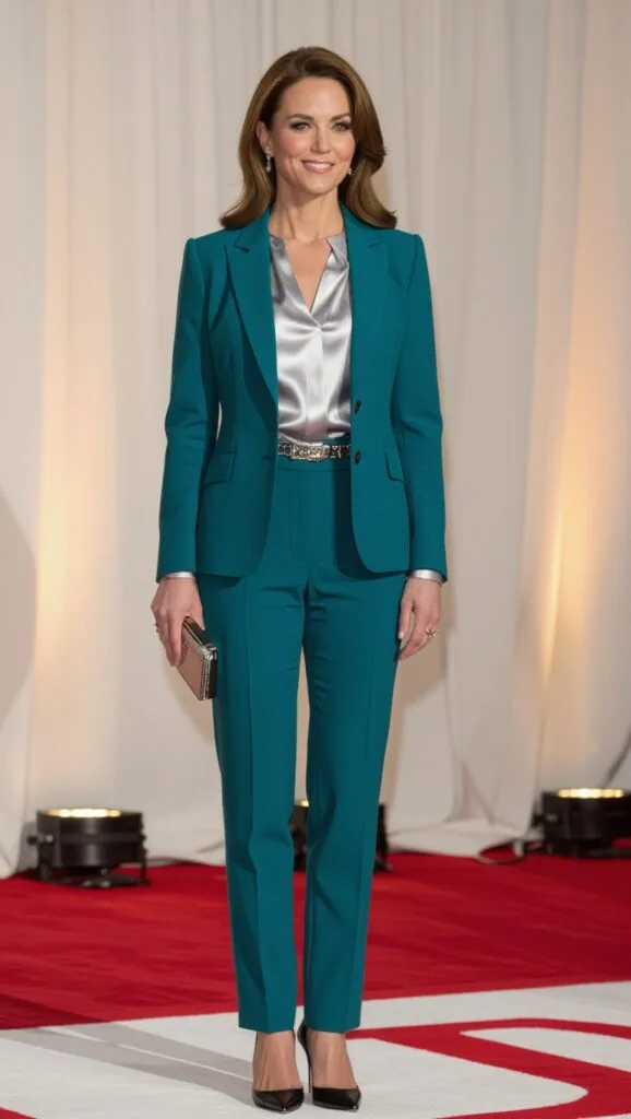 A bold teal suit with a metallic silver blouse turns heads at a corporate awards event. Black pumps and a structured bag add sleek sophistication to this modern look.