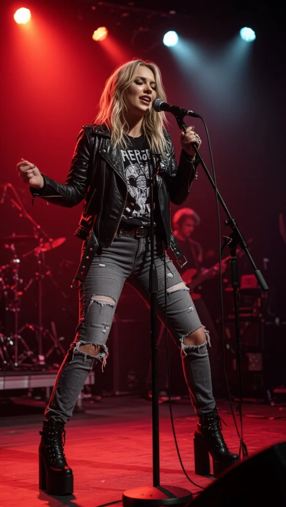 Channel rockstar energy with a band tee under a leather jacket, paired with ripped jeans for an edgy, confident look. Perfect for gigs or casual nights, add layered chains to amplify the tough-yet-feminine vibe that’s pure rebel magic.