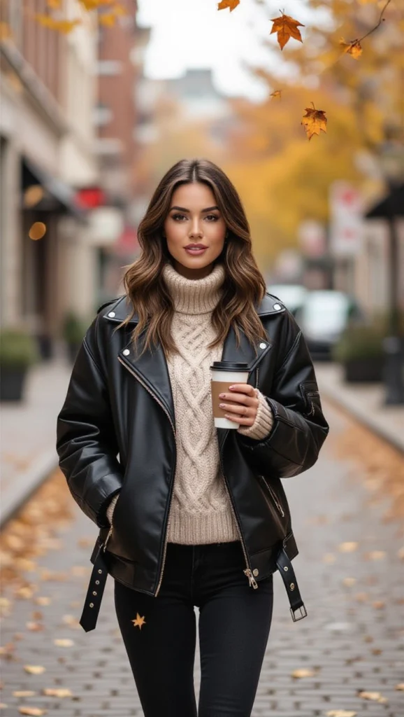Picture a soft knit sweater hugging you under your leather jacket—it’s the cozy confidence boost that perfects a leather jacket for chilly office days, blending warmth with a chic, empowering silhouette.