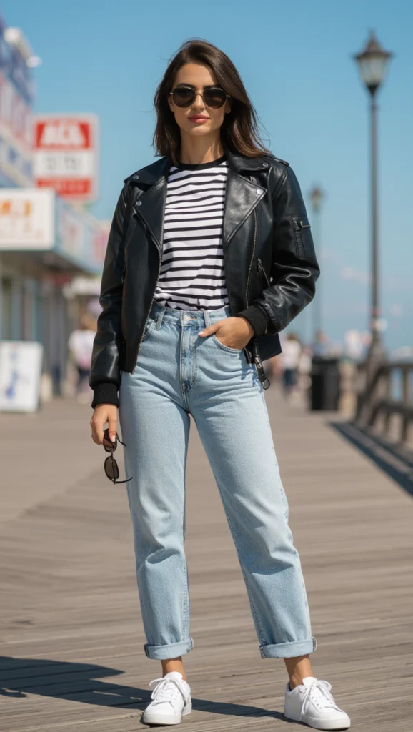 Nail nostalgic cool with a striped tee and jeans under a bomber jacket, a playful retro look for casual Fridays. This put-together outfit shines at picnics or movie nights—add white sneakers to keep the vibe fresh and timelessly fun.