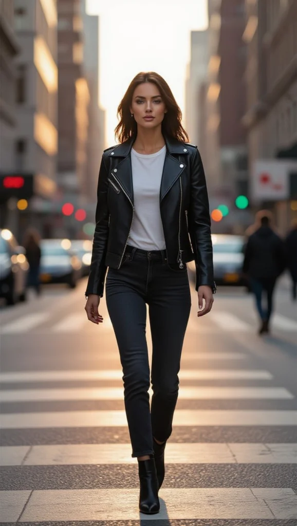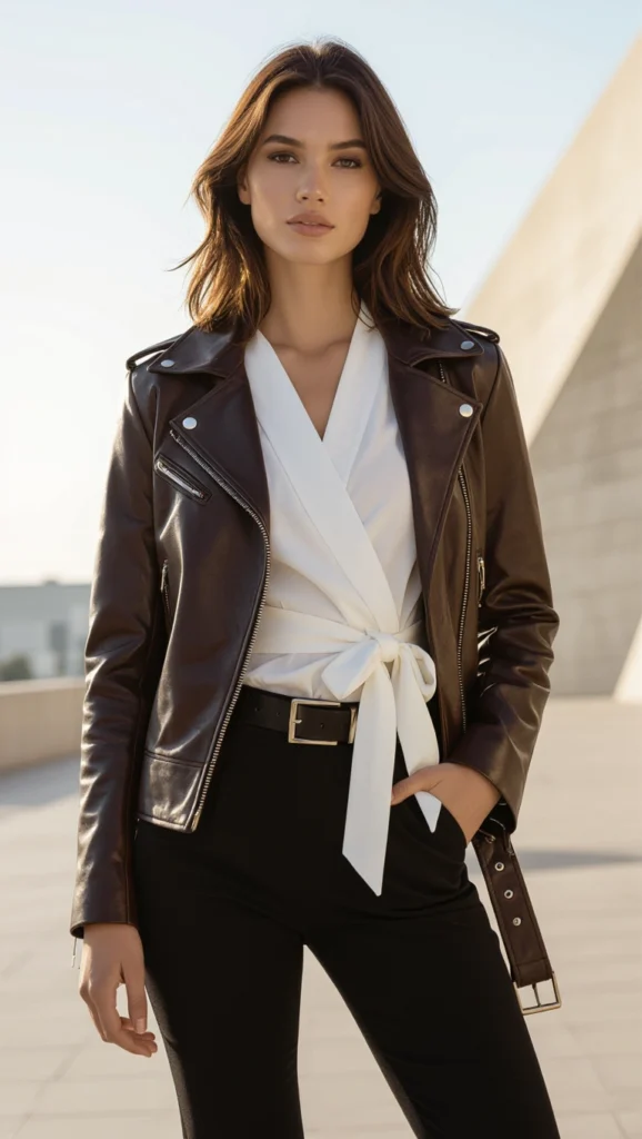 Drawing from trendy office ensembles, this look adapts to creative workspaces with accessories like pearl earrings, ensuring your leather jacket outfits exude confident charm without sacrificing professionalism. It’s like painting elegance on a rebel canvas, turning heads while you conquer the day.