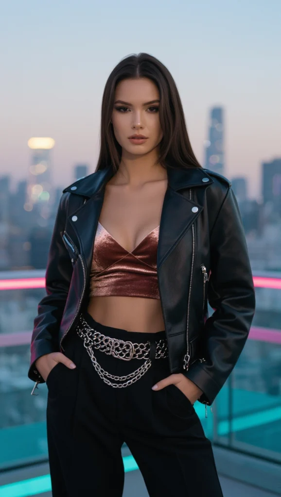 Make a statement with a fitted crop top and high-waisted pants under a leather jacket, a bold, playful vibe for electric nights. Great for clubbing or parties, add a chain belt to amplify the daring edge of this confident, glamorous ensemble.