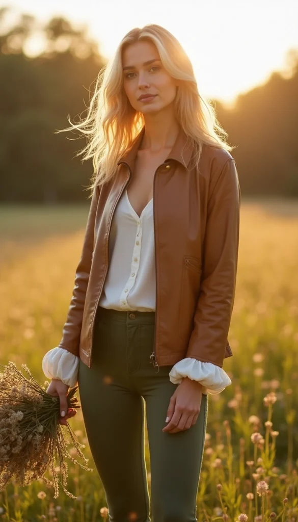 Unleash your free spirit with a flowy peasant blouse under a leather jacket, a bohemian dream with lace trims for whimsy. Perfect for festivals or nature walks, pair with a maxi skirt to enhance the sustainable, romantic movement of this enchanting style.