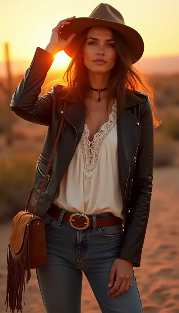 Blend boho with badass in a flowy blouse and leggings under a leather jacket, contrasting toughness with earthy charm. Ideal for weekend adventures or festivals, add ankle boots to ground this sustainable, whimsical style that dances with free-spirited energy.