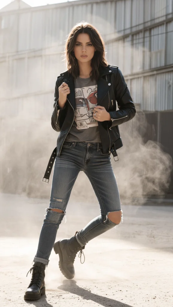 Unleash your inner rebel with a graphic tee and slim jeans under a leather jacket, the ultimate street-style uniform. Perfect for concerts or casual hangs, this timeless look rocks with combat boots, channeling rock ‘n’ roll edge with effortless cool.