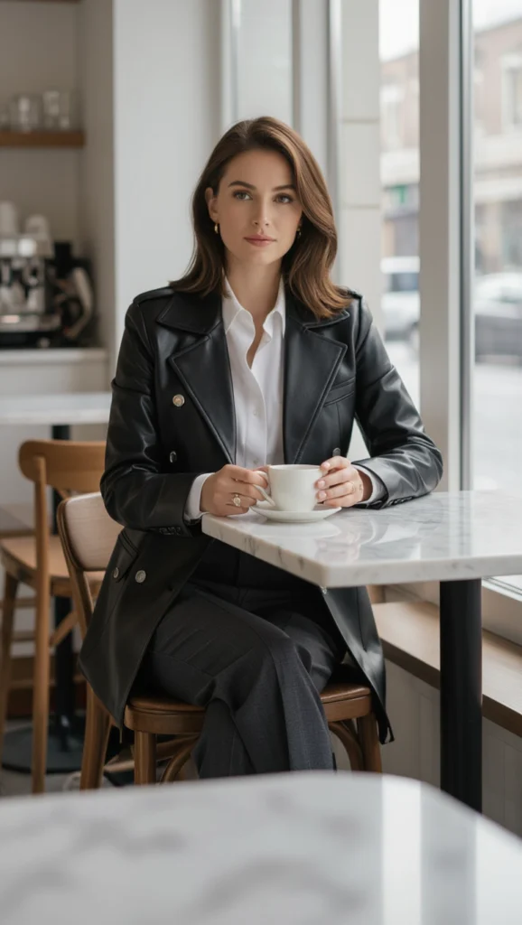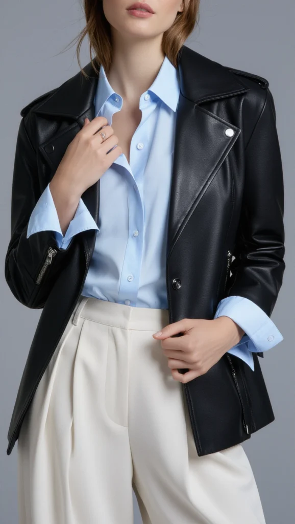 Create high-drama chic with a tailored shirt under an oversized leather jacket, countering volume with crisp, elegant lines. Ideal for upscale brunches or meetings, accessorize with a structured bag to amplify the intentional, sophisticated edge of this bold look.
