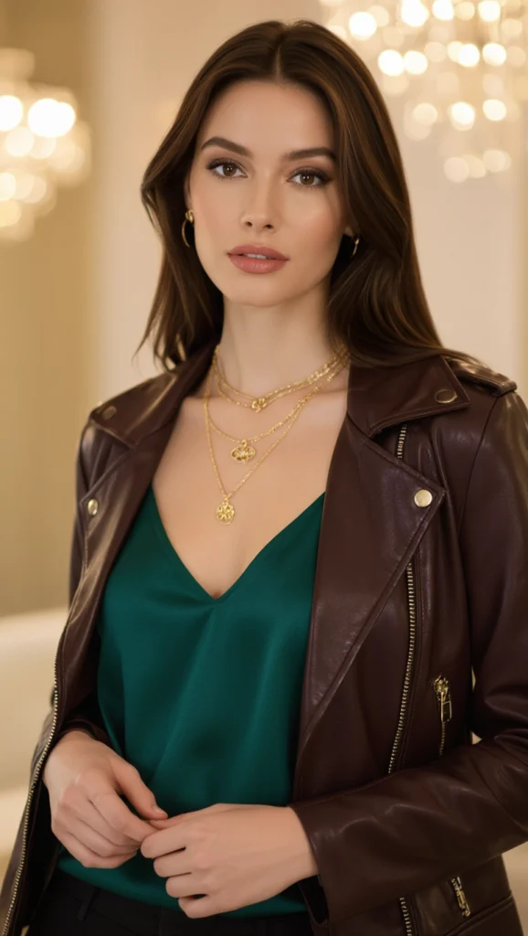 Glam up your evening with a silk camisole peeking from under a moto jacket, a duo that mixes toughness with luxe allure. Perfect for date nights, the cami’s sheen contrasts the leather’s grit—style with statement earrings for a fierce yet feminine finish.