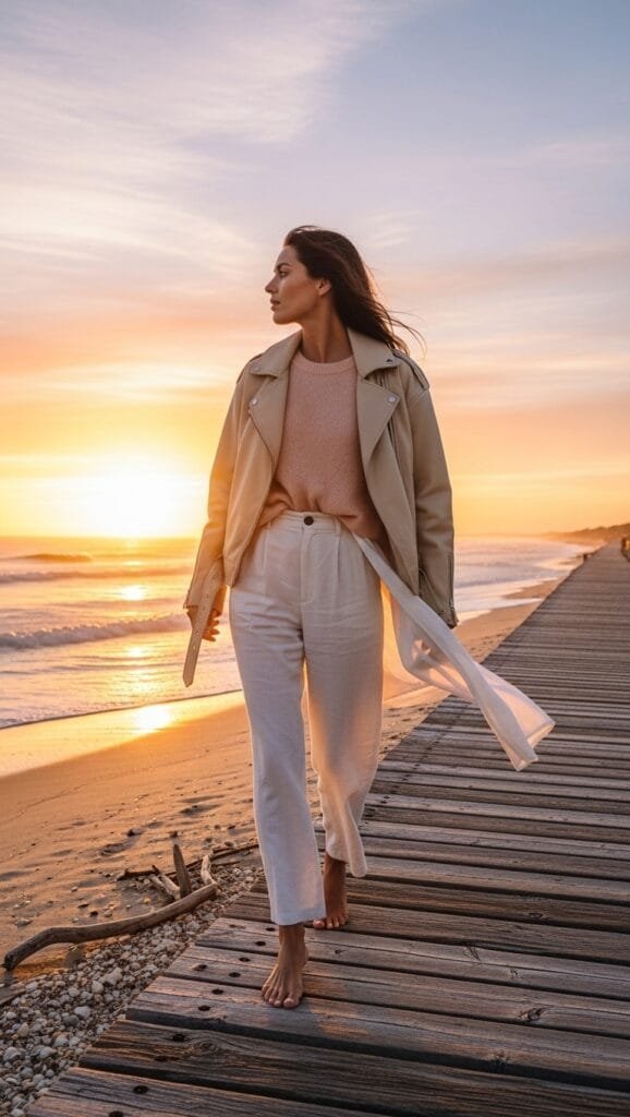 Who says errands and coffee runs can’t be a runway moment? When it comes to what to wear under a leather jacket for those laid-back days, think effortless pairings that blend urban edge with a touch of boho whimsy—sustainable fabrics like organic cotton add an eco-glam twist, keeping your vibe fresh, comfy, and planet-friendly while turning heads on the street.