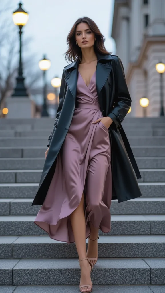 Choose a bias-cut slip in satin or modal that skims your curves without clinging, in deep hues like midnight black or ruby red, letting the jacket’s tough exterior contrast the dress’s fluid grace for a balanced, body-positive silhouette.